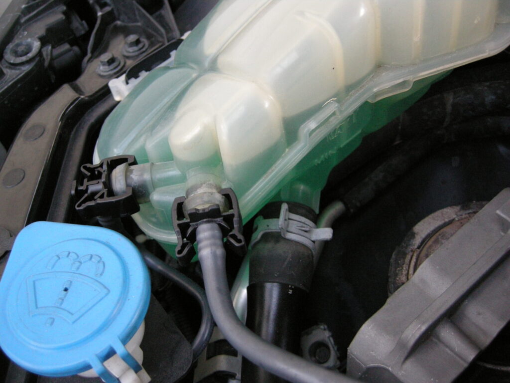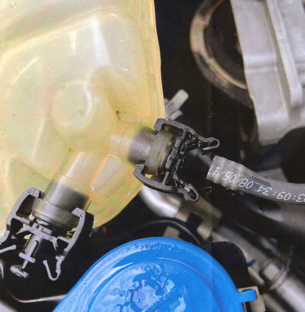 リザーバーサブタンクに取り付けられた2本のエア抜き兼ねた細いホースのうち向かって右側のプラスチックブラケットの差込口が折れてだだ洩れ。ディーラーでは5年経過で交換推奨しているとのこと。web上でも同様のケースが散見され、部品強度に問題ありそうです。5年以上経過のこのタイプの部品は要注意ですぞ。